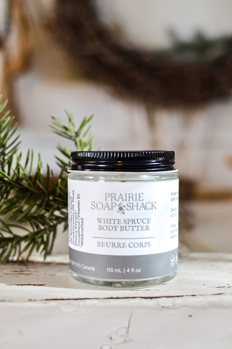 Bring the calm of the northern forest to your skincare ritual with our White Spruce Body Butter. Infused with wildcrafted white spruce needles, this deeply moisturizing butter captures the crisp, woodsy scent of evergreen blended with soft notes of cedarwood, lavender, and frankincense.