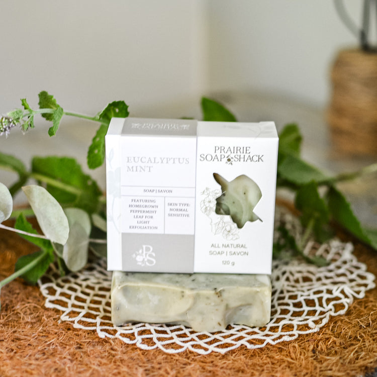 A refreshing favourite, our Eucalyptus Mint soap is designed to cleanse, invigorate, and awaken your senses. Cooling eucalyptus and peppermint essential oils create a soothing, spa-like lather, while finely ground peppermint leaves from our garden provide gentle exfoliation and a naturally revitalizing aroma. Naturally tinted with spirulina, this bar offers a fresh, uplifting cleanse that leaves your skin feeling soft, smooth, and renewed.